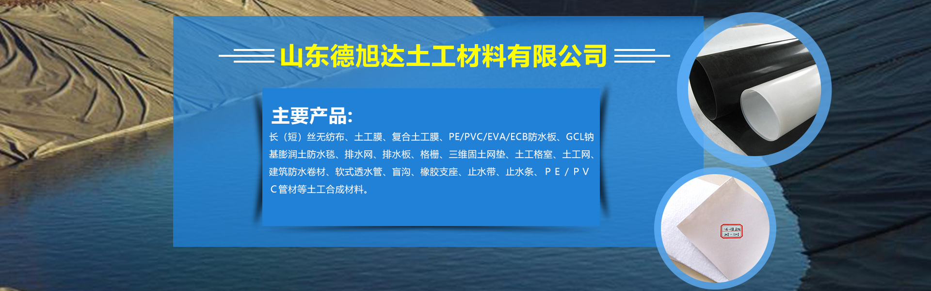 聚酯長絲土工布、滌綸短絲無紡土工布、復合土工膜、防滲土工布、HDPE土工膜(防滲膜)等產品